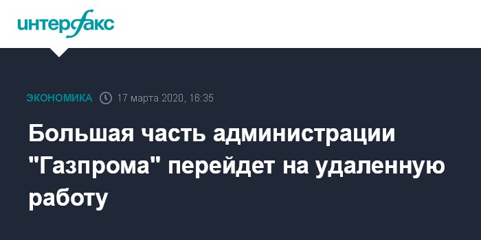 Москва. 17 марта. INTERFAX.RU - Большая часть сотрудников головной компании ПАО "Газпром" (администрация) переходит на работу в удаленном режиме.