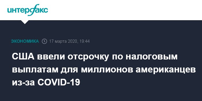 Москва. 17 марта. INTERFAX.RU - Власти США объявили об отсрочке по налоговым выплатам для миллионов американцев, пойдя на беспрецедентный шаг, чтобы поддержать граждан в условиях кризиса, связанного с распространением коронавируса.