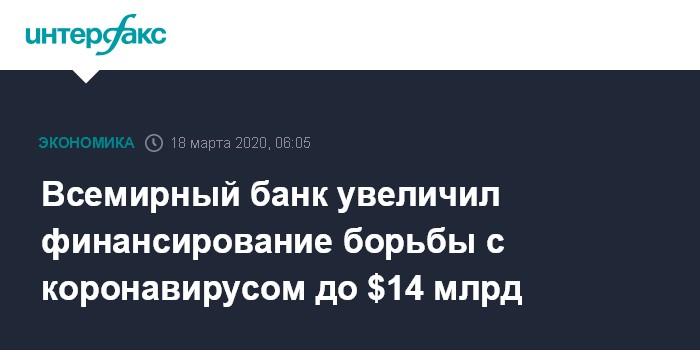 Москва. 18 марта. INTERFAX.RU - Всемирный банк заявил, что на $2 млрд увеличил фонд быстрого финансирования на борьбу с коронавирусом - до $14 млрд.