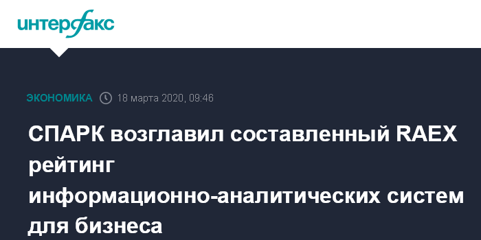 Москва. 18 марта. INTERFAX.RU - Система "СПАРК-Интерфакс" с большим отрывом возглавила составленный Рейтинговым агентством RAEX ("РАЭКС-Аналитика") рэнкинг информационно-аналитических систем по проверке контрагентов.