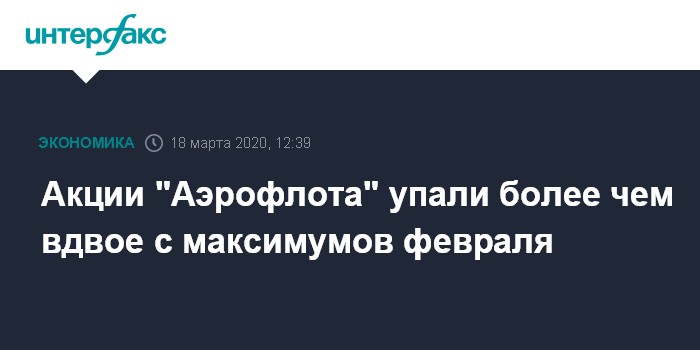 Москва. 18 марта. INTERFAX.RU - Падение цен акций "Аэрофлота" в среду превысило 10%, бумаги компании с максимумов февраля подешевели уже более чем вдвое на распродажах в условиях отмены рейсов авиакомпании на фоне общемирового распространения пандемии коронавируса.