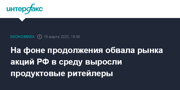 Москва. 18 марта. INTERFAX.RU - Рынок акций РФ в среду продолжил обвальное падение вместе с мировыми площадками и нефтью на фоне бегства инвесторов из рисковых активов в условиях продолжающегося расширения пандемии коронавируса COVID-2019; лидерами отката выступили акции "Аэрофлота", несущего убытки из-за закрытия многих направлений авиарейсов, а фаворитами стали акции продуктовых ритейлеров.