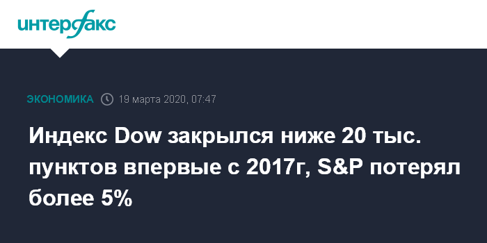 Москва. 19 марта. INTERFAX.RU - Американские фондовые индексы рухнули в среду на фоне тревог инвесторов по поводу последствий пандемии коронавируса для экономики, при этом индекс Dow Jones упал ниже 20 тыс. пунктов впервые с февраля 2017 года, а индекс S&P 500 опустился почти на 30% с рекорда, установленного в прошлом месяце.