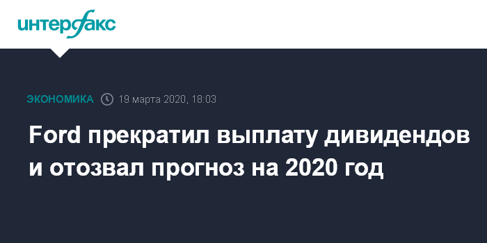 Москва. 19 марта. INTERFAX.RU - Автопроизводитель Ford Motor сообщил, что прекращает выплату дивидендов и отзывает прогноз на 2020 год из-за пандемии коронавируса.