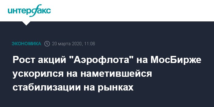 Москва. 20 марта. INTERFAX.RU - Рост акций "Аэрофлота" в ходе торгов на Московской бирже в пятницу утром ускорился и достиг 18,5%, ценные бумаги компании активно восстанавливаются в цене на фоне наметившейся стабилизации ситуации на мировых рынках.