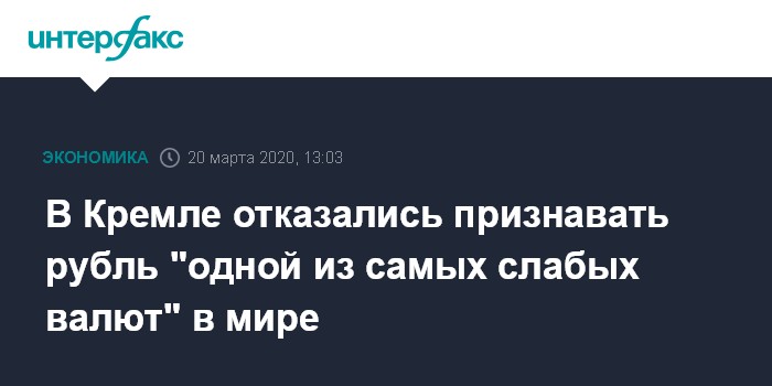 Москва. 20 марта. INTERFAX.RU - Российские макроэкономические параметры позволяют с уверенностью прогнозировать, что волатильность рубля сменится стабильностью его курса, заявил пресс-секретарь президента РФ Дмитрий Песков; он также отказался признать российскую валюту "одной из самых слабых" в мире.