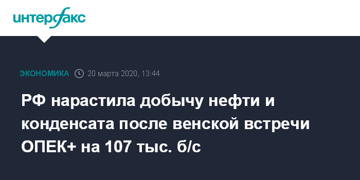 По итогам заседания в Вене 6 марта страны-производители нефти не договорились о продолжении сделки ОПЕК+, и теперь с 1 апреля российские нефтекомпании освобождены от обязательств по сокращению нефтедобычи. До этого времени, по условиям сделки ОПЕК+, Россия в первом квартале 2020 года должна снизить добычу нефти на 300 тыс. б/с ниже объема производства в октябре 2018 года - до 10,326 млн б/с.
