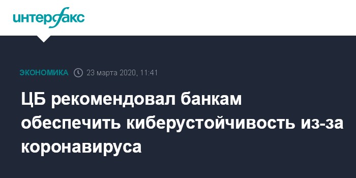 Москва. 23 марта. INTERFAX.RU - Банк России разослал банкам и некредитным финансовым организациям (НФО) рекомендации по обеспечению киберустойчивости и информационной безопасности на фоне пандемии коронавируса.