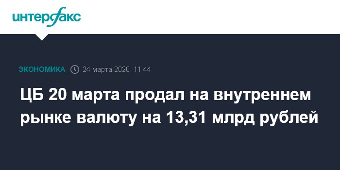 Москва. 24 марта. INTERFAX.RU - Банк России в рамках упреждающих мер продал 20 марта на внутреннем рынке валюту на 13,31 млрд рублей, следует из данных регулятора.
