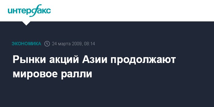 Токио. 24 марта. INTERFAX.RU - Рынки акций Азиатско-Тихоокеанского региона продолжают расти во вторник в рамках мирового ралли, которое привело к взлету индекса MSCI World до максимума за 5 недель, на ожиданиях, что план министерства финансов США по покупке неликвидных банковских активов поможет восстановить кредитование, сообщает агентство Bloomberg.