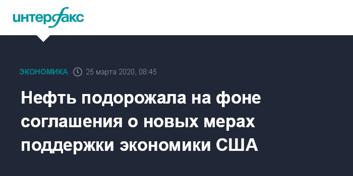 Москва. 25 марта. INTERFAX.RU - Цены на нефть эталонных марок уверенно растут на новостях о достижении в ночь на среду сенаторами-демократами и администрацией Дональда Трампа соглашения по $2-триллионному пакету мер стимулирования экономики в условиях пандемии, вызванной коронавирусом COVID-19.