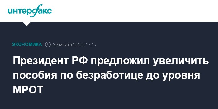 Москва. 25 марта. INTERFAX.RU - Президент РФ Владимир Путин предложил увеличить пособия по безработице до уровня одного минимального размера оплаты труда (МРОТ).