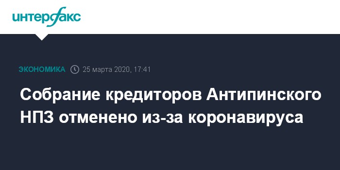 Москва. 25 марта. INTERFAX.RU - Собрание кредиторов Антипинского НПЗ, назначенное на 2 апреля, будет перенесено из-за коронавируса, сообщается на сайте Единого федерального реестра сведений о банкротстве. В Тюменской области, где оно должно было пройти, введен режим повышенной готовности и там запрещены мероприятия с участием более 50 человек одновременно.