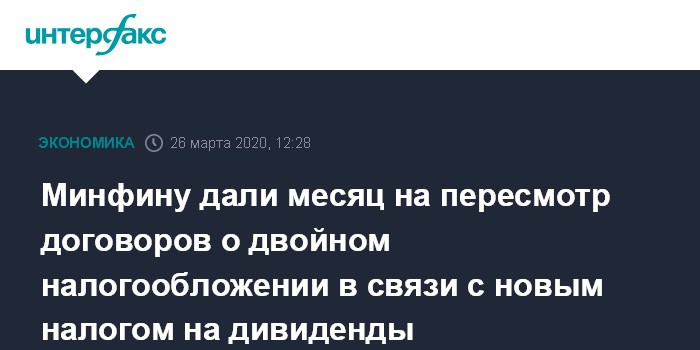 Москва. 26 марта. INTERFAX.RU - Премьер-министр Михаил Мишустин дал Минфину месяц на пересмотр всех соглашений с другими странами об избежании двойного налогообложения в связи со введением новой ставки налога на дивиденды, выводимые за рубеж, в офшоры. Он сказал это на заседании правительства.