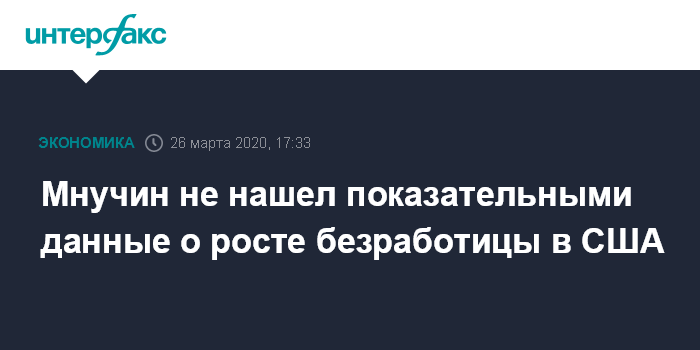 Москва. 26 марта. INTERFAX.RU - Министр финансов США Стивен Мнучин считает несущественным показателем рекордный скачок числа заявок на пособие по безработице на прошлой неделе, эти данные отражают ситуацию до согласования программы помощи экономике объемом $2 трлн.