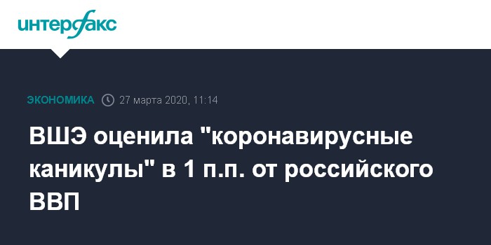 Москва. 27 марта. INTERFAX.RU - Нерабочая неделя с 30 марта по 3 апреля будет "стоить" российскому ВВП в 2020 году около 1 процентного пункта, говорится обзоре института "Центр развития" НИУ ВШЭ "Комментарии о государстве и бизнесе".