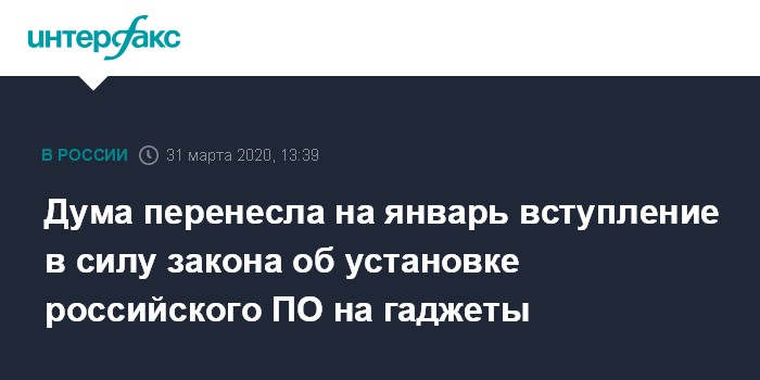 Москва. 31 марта. INTERFAX.RU - Депутаты Госдумы приняли в третьем чтении поправки о переноса с 1 июля 2020 на 1 января 2021 года закона с требованием о предустановке российского программного обеспечения на все гаджеты, которые продаются в России.
