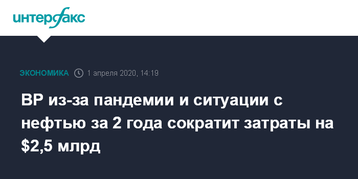 Москва. 1 апреля. INTERFAX.RU - BP в течение двух лет планирует сократить затраты на $2,5 млрд, это одна из мер, которые компания предпринимает в ответ на пандемию COVID-19 и продолжающееся падение цен на нефтяном рынке.