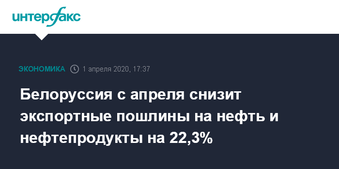 Москва. 1 апреля. INTERFAX.RU - Белоруссия с 1 апреля 2020 года снижает на 22,3% экспортные пошлины на нефть и нефтепродукты, вывозимые за пределы таможенной территории Евразийского экономического союза (ЕАЭС).