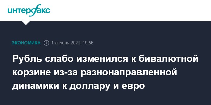 Москва. 1 апреля. INTERFAX.RU - Доллар повышается, евро, напротив, дешевеет на "Московской бирже" в среду вечером, рубль слабо меняется к бивалютной корзине в условиях разнонаправленной динамики в основных парах, следующих за котировками евро к доллару на глобальном рынке.