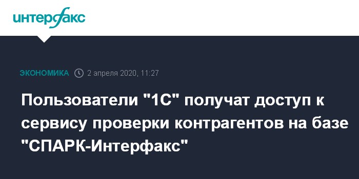 Москва. 2 апреля. INTERFAX.RU - Фирма "1С" и Международная информационная группа "Интерфакс", чтобы оказать поддержку бизнесу в нынешний сложный период, начали предоставлять пользователям программ 1С бесплатный доступ сроком на 60 дней к сервису по проверке контрагентов на базе системы "СПАРК-Интерфакс".