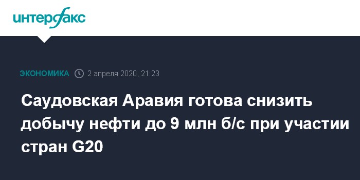 Москва. 2 апреля. INTERFAX.RU - Саудовская Аравия готова ограничить свою добычу нефти уровнем ниже 9 млн баррелей в сутки, если другие страны, входящие в G20, присоединятся к сокращениям, пишет WSJ со ссылкой на представителей королевства.