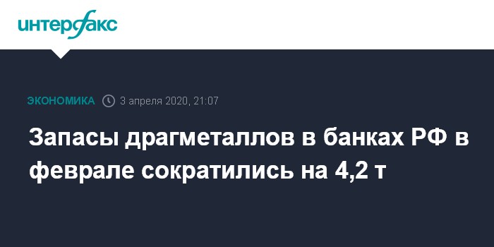 Москва. 3 апреля. INTERFAX.RU - Запасы драгметаллов в банках РФ в феврале 2020 года сократились в пересчете на золото на 4,2 тонны (5%), следует из отчетности кредитных организаций, опубликованной на сайте ЦБ РФ.
