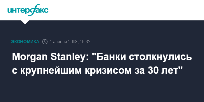 Нью-Йорк. 1 апреля. INTERFAX.RU - Банки из-за турбулентности на кредитных рынках столкнулись с крупнейшим за 30 лет кризисом, превосходящим "черный понедельник", валютный кризис в Азии и лопнувший пузырь интернет-компаний, полагают эксперты Morgan Stanley.
