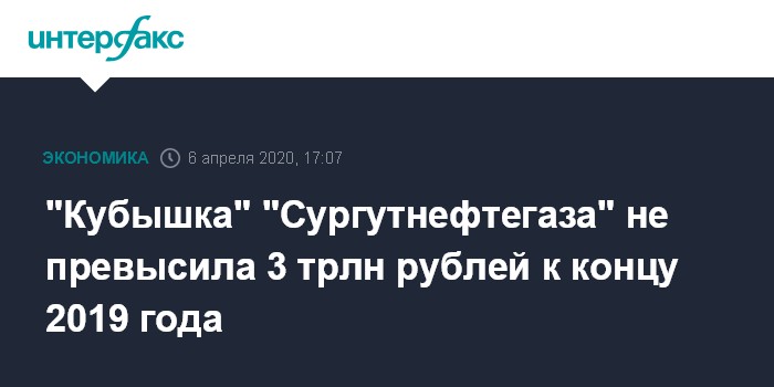 Москва. 6 апреля. INTERFAX.RU - Ликвидные активы "Сургутнефтегаза" - так называемая "кубышка" - на конец 2019 года составили 2,977 трлн рублей, следует из годового отчета компании по РСБУ. На конец 2018 года они составляли 3,06 трлн рублей, на конец октября 2019 года - 2,981 трлн рублей.