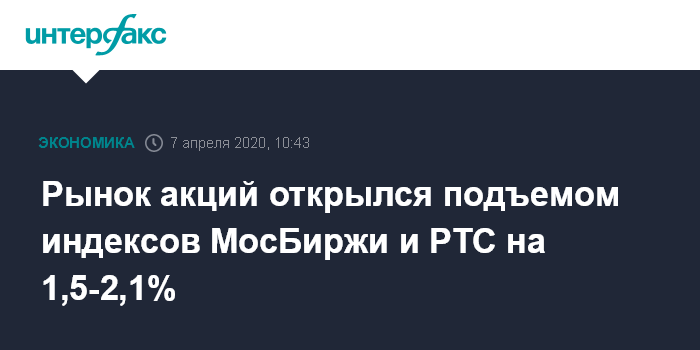 Москва. 7 апреля. INTERFAX.RU - Рынок акций РФ открылся во вторник дальнейшим ростом цен blue chips вслед за мировыми площадками и нефтью на фоне надежд, что распространение коронавирусной инфекции COVID-19 в США и Европе начинает замедляться; индексы МосБиржи и РТС за минуту торгов прибавили 1,5-2,1%, причем последний превысил рубеж 1100 пунктов.