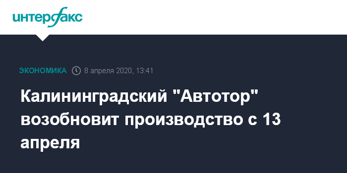 Москва. 8 апреля. INTERFAX.RU - Группа компаний "Автотор" решила возобновить производство автомобилей с 13 апреля, говорится в сообщении пресс-службы компании.