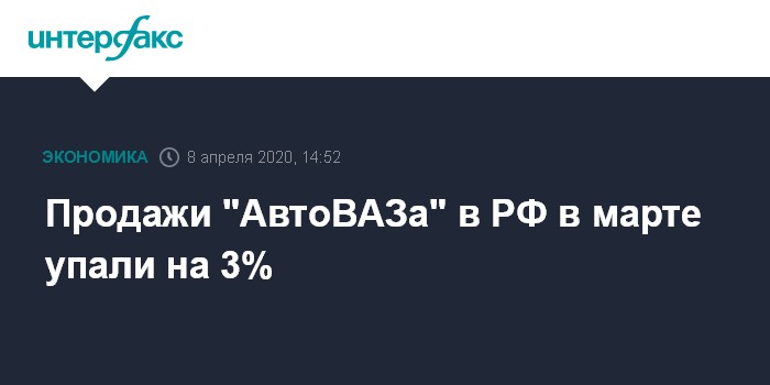Москва. 8 апреля. INTERFAX.RU - Продажи в России автомобилей Lada производства АО "АвтоВАЗ" в марте 2020 года снизились на 3% в сравнении с тем же периодом прошлого года, до 32 808 штук, сообщила Ассоциация европейского бизнеса (АЕБ).