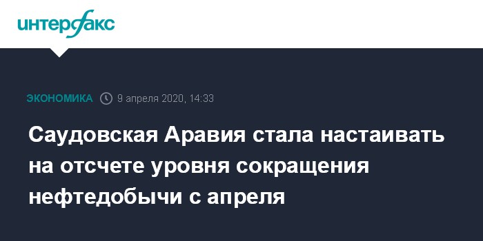 Ранее президент РФ Владимир Путин, говоря о необходимости возможных согласованных сокращений, заявил, что снижать добычу нужно с уровня первого квартала. В первом квартале Саудовская Аравия добывала 9,8 млн б/с, а с апреля страна увеличила производство до 12,3 млн б/с.