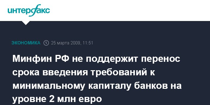 Минфин РФ не поддержит перенос срока введения требований к минимальному капиталу банков на уровне 2 млн евро