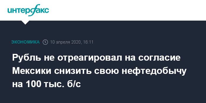 Как отмечают эксперты "Интерфакс-ЦЭА", рубль не отреагировал на сообщение о согласовании уровня снижения нефтедобычи Мексики. Об этом передало агентство Bloomberg со ссылкой на слова президента страны Андреса Мануэля Лопеса Обрадора. В ночь с четверга на пятницу страны ОПЕК+ согласовали сделку по сокращению нефтедобычи при условии, что к ней присоединится Мексика, которую не удалось уговорить во время 11-часового заседания альянса.