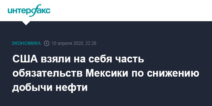 Москва. 10 апреля. INTERFAX.RU - Соединенные Штаты помогут Мексике сократить добычу нефти, взяв на себя часть ее обязательств - 250-300 тыс. б/с, заявил в пятницу президент США Дональд Трамп.