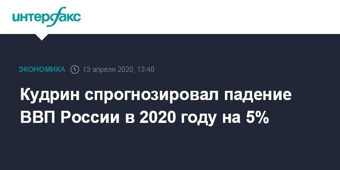 Москва. 13 апреля. INTERFAX.RU - Глава Счетной палаты РФ Алексей Кудрин ожидает падения российской экономики в 2020 году на уровне ближе к 5%.