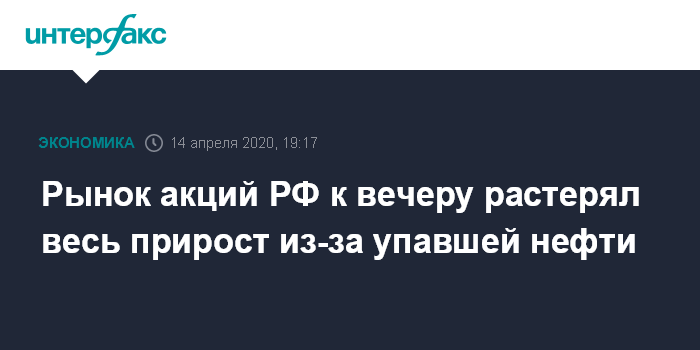 Москва. 14 апреля. INTERFAX.RU - Рынок акций РФ к закрытию торгов вторника растерял почти весь утренний рост из-за падения нефтяных бумаг вслед за нефтью (Brent упала ниже $30 за баррель) на опасениях за мировой спрос на сырье в условиях карантина из-за коронавируса; в лидерах роста выступили обновившие максимумы акции золотодобывающих компаний на фоне восьмилетних рекордов по золоту.