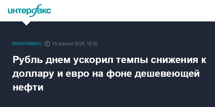 Москва. 15 апреля. INTERFAX.RU - Доллар и евро усилили рост на Московской бирже в среду днем; рубль активно дешевеет к бивалютной корзине вслед за котировками нефти, ускорившими снижение на опасениях дальнейшего сокращения спроса из-за состояния глобальной экономики в условиях пандемии COVID-19.