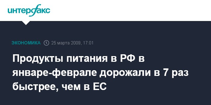 При этом в феврале 2009 г. продукты питания в РФ стали дороже на 1,9,%, в то время как в странах ЕС в среднем подешевели на 0,1%.