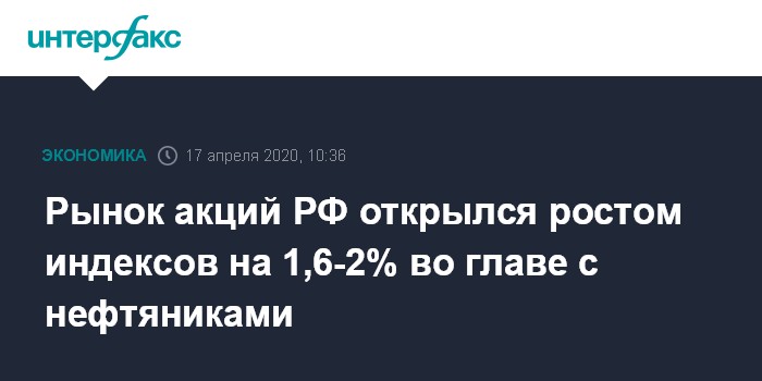 Москва. 17 апреля. INTERFAX.RU - Рынок акций РФ открылся в пятницу ростом цен blue chips во главе с нефтяными бумагами на фоне подъема мировых площадок и нефти, подогретых неплохой статистикой по ВВП Китая и ожиданиями постепенного снятия карантина по COVID-19 в США; индексы МосБиржи и РТС за минуту торгов выросли на 1,6-2%.