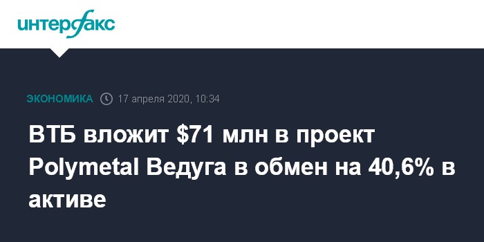 Москва. 17 апреля. INTERFAX.RU - Банк ВТБ инвестирует $71 млн в Ведугу, золоторудное месторождение в Красноярском крае, в обмен на 40,6% в активе, сообщила компания Polymetal, контролирующая проект.