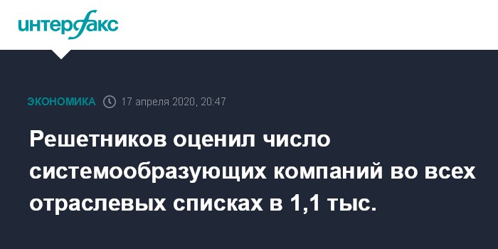 Москва. 17 апреля. INTERFAX.RU - Общее число системообразующих компаний по всем отраслевым перечням может составить 1-1,1 тысячи предприятий, заявил глава Минэкономразвития РФ Максим Решетинков в эфире РБК-ТВ.