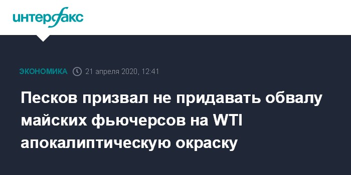 "Вчера произошел обвал цен на фьючерсы, на майские фьючерсы. Цены на нефть уходили в отрицательные значения. Что касается вот этой вот свистопляски с фьючерсами, то это абсолютно такой спекулятивный момент, чисто торговый момент, который был связан с датой закрытия торгов по фьючерсам на май. И безусловно этому не нужно придавать какую-то апокалиптическую окраску", - заявил пресс-секретарь президента РФ Дмитрий Песков в ходе общения с журналистами во вторник.