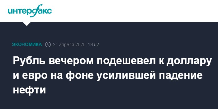 Москва. 21 апреля. INTERFAX.RU - Доллар и евро заметно усилили темпы роста и находятся на максимальных отметках с первой недели апреля на "Московской бирже" во вторник вечером; рубль активно дешевеет к бивалютной корзине на фоне ускорившей падение нефти из-за опасений, что сырье вскоре негде будет хранить в условиях отсутствия спроса.