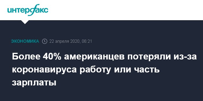 Москва. 22 апреля. INTERFAX.RU - Согласно результатам опроса общественного мнения, проведенного Pew Research Center, не менее четырех из 10 опрошенных американцев заявили, что им сократили зарплату или они потеряли работу из-за пандемии коронавируса.