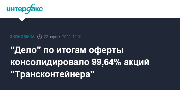 Москва. 21 апреля. INTERFAX.RU - Структура группы "Дело" - ООО "Дело-Центр" - консолидировала 99,64% акций ПАО "Трансконтейнер", следует из сообщения оператора.