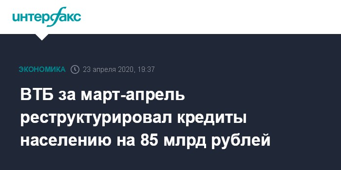 Москва. 23 апреля. INTERFAX.RU - ВТБ за март-апрель реструктурировал кредиты населению на сумму более 85 млрд рублей. В той или иной форме эта помощь была оказана более чем 100 тыс. граждан.