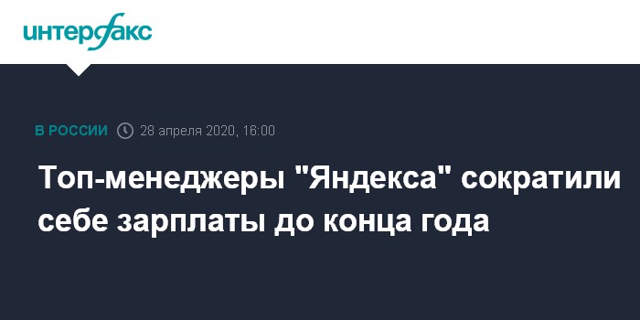 Москва. 28 апреля. INTERFAX.RU - Топ-менеджеры "Яндекса" решили сократить себе зарплаты до конца 2020 года, сообщил в ходе телеконференции операционный и финансовый директор группы Грег Абовский. Они также отказались от бонусов. Насколько сократятся зарплаты, он не уточнил.