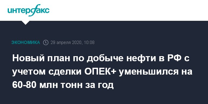 Москва. 29 апреля. INTERFAX.RU - Новый план по добыче жидких углеводородов (нефть и конденсат) в 2020 году с учетом заключения сделки ОПЕК+ по сокращению нефтедобычи составляет 480-500 млн тонн, сообщил в интервью министр энергетики РФ Александр Новак.